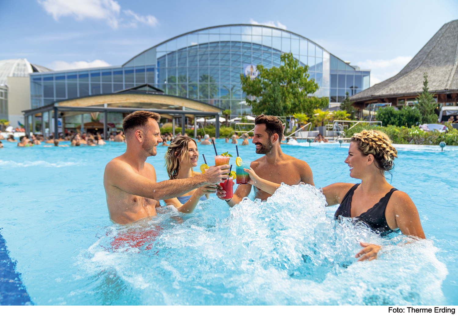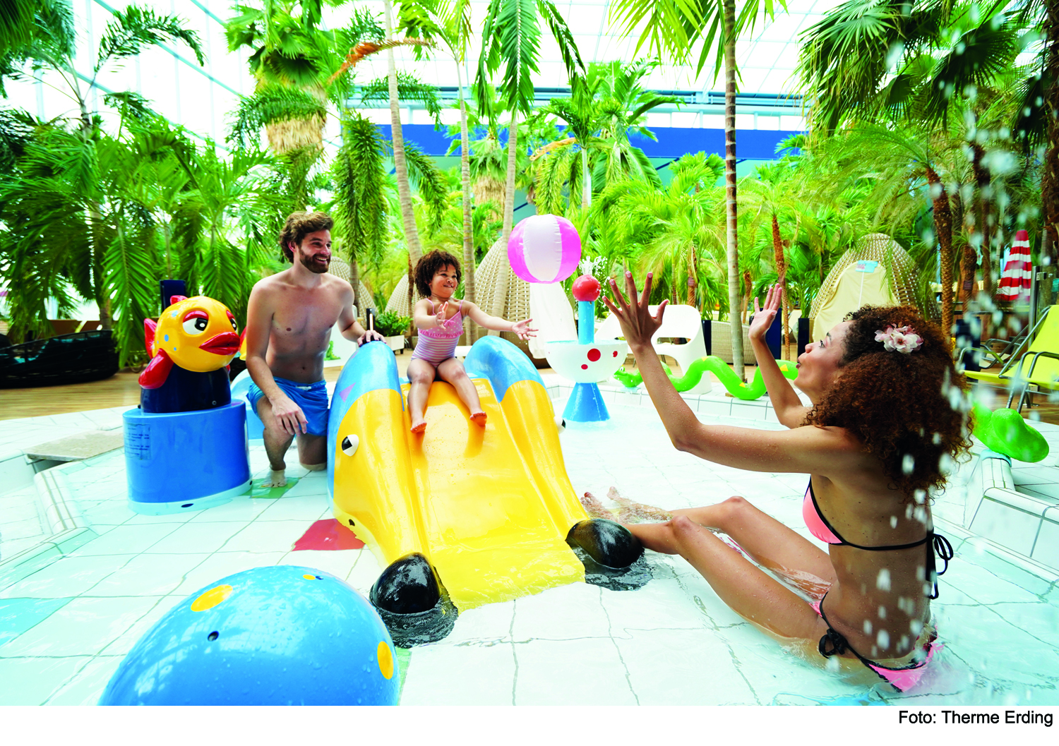 Zusätzlich ist in den Erlebnisbädern der Therme Erding noch einiges für Groß und Klein geboten: 28 Mega-Rutschen begeistern im Galaxy Erding, im Wellenbad fühlt man sich wie im Urlaub am Meer und in der exotischen Therme steht wohltuendes Thermalheilbaden auf dem Programm.