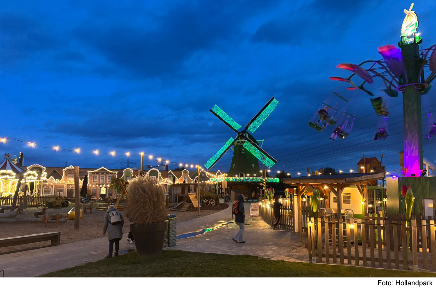 Im Ziel erwartet die Gäste ein stimmungsvoller Weihnachtsmarkt rund um die Mühle im Holland-Park. Bereits ab 14:00 Uhr lädt der Markt zum „Vorglühen“ und Stöbern ein. Zwischen glitzernden Lichterketten, handgefertigten Geschenkideen und festlicher Musik bieten zahlreiche Hütten kulinarische Köstlichkeiten und ein vielfältiges Angebot zum Verweilen. Während der gesamte Park mit seinen Attraktionen, Shops und gastronomischen Angeboten bis 22:00 Uhr geöffnet bleibt, können Besucher auf dem Weihnachtsmarkt an der Mühle den Winterabend bei Glühwein und Punsch sogar bis Mitternacht genießen.