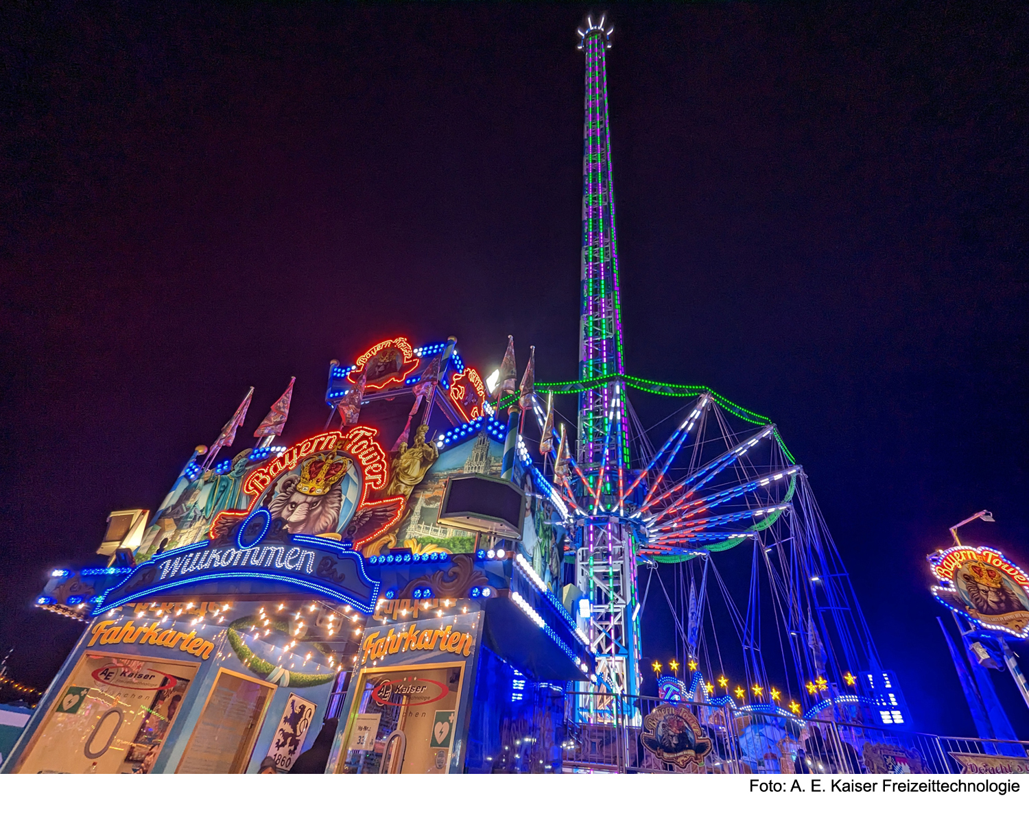 „Der BayernTower ist ein imposanter Hochkettenflieger in bayrischer Aufmachung mit einer Fluggeschwindigkeit von bis zu 70 km/h“, berichtet Neumann. In luftiger Höhe von rund 90 Metern drehen sich die Gondeln majestätisch über dem Festplatz und bieten einen spektakulären Rundumblick. Mit bayerischem Charme, vielen handgemalten Verzierungen, akustischen Effekten, stimmungsvoller Musik und sanftem Nervenkitzel ist der BayernTower ein Highlight für alle, die die Aussicht genießen und sich den Wind um die Ohren wehen lassen möchten.