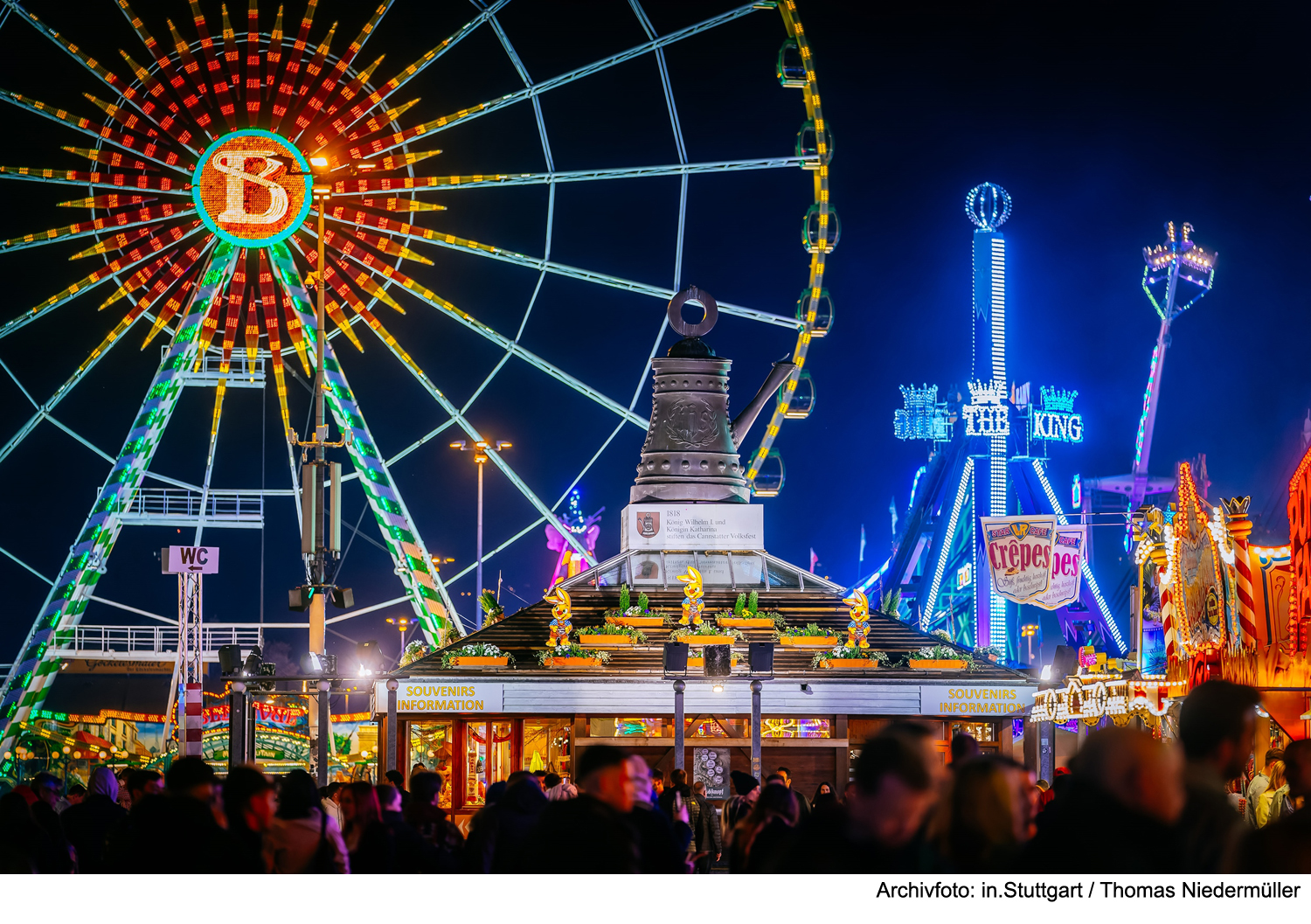In luftige Höhen von bis zu 18 Metern können sich die Besuchenden auf dem Riesenrad „Königs Radl“ begeben. Für Kinder ab vier Jahren gibt es die Familien-Achterbahn „Ring-Renner“.