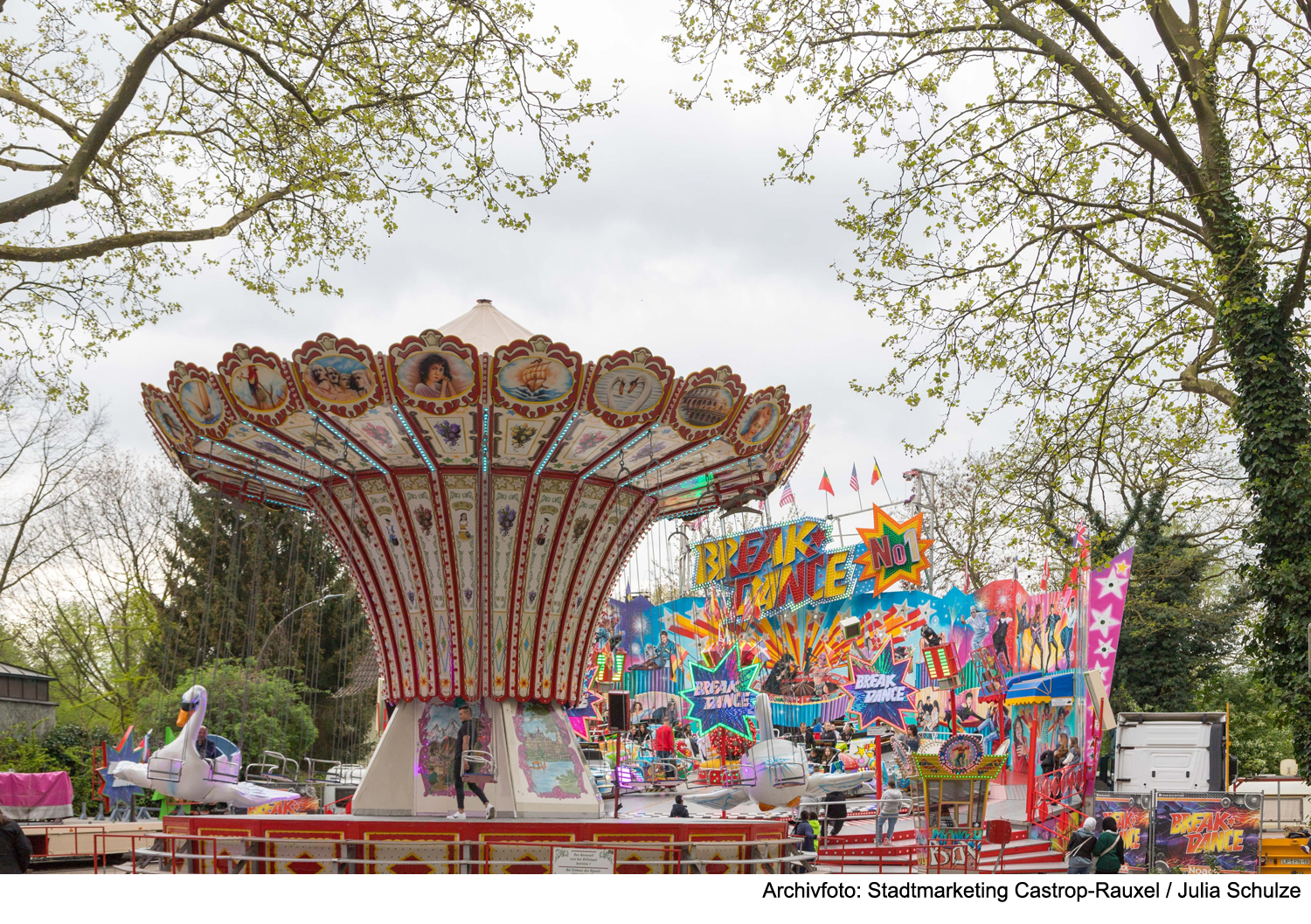 Mehr als 70 Kirmesattraktionen locken aufgrund des Feiertages bereits ab Donnerstag, 1. Mai 2025, Besucherinnen und Besucher in die Castroper Altstadt. Bis einschließlich Montag, 5. Mai 2025, öffnen die Fahrgeschäfte und Verkaufsstände täglich von 14:00 Uhr bis 22:00 Uhr.