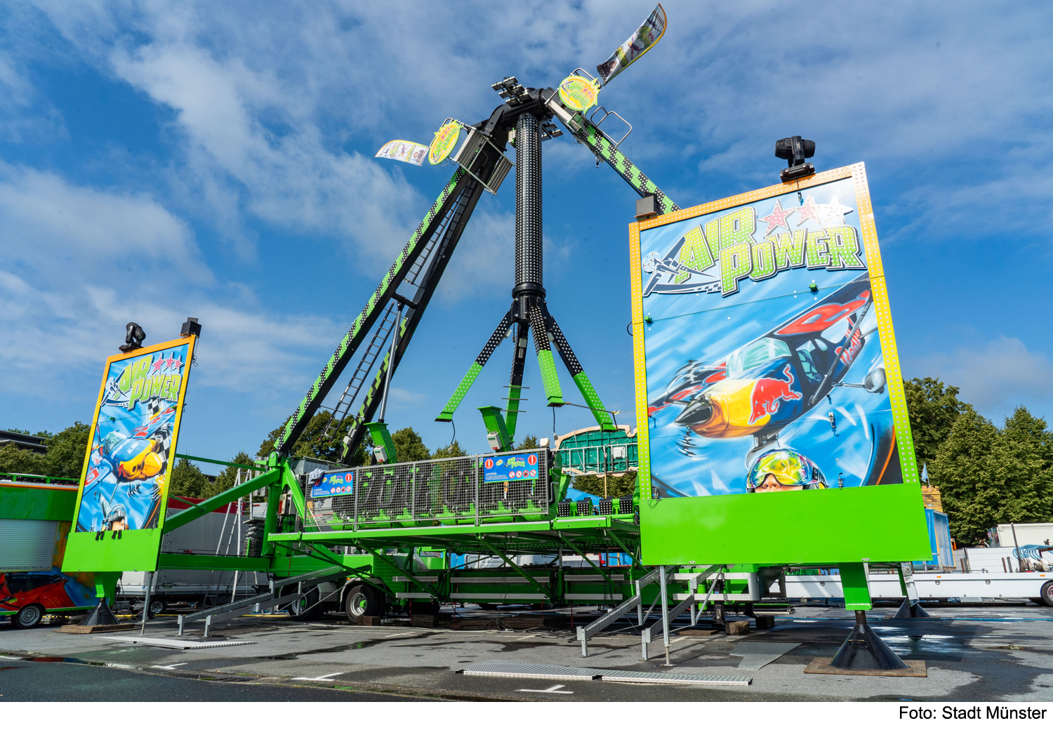 Zu den Attraktionen des Sommersends zählt die 42 Meter hohe Schaukel „No Limit“, bei der Besucherinnen und Besucher Loopings absolvieren und sich sogar über Kopf drehen können. Das Fahrgeschäft „Air Power“, das erstmals in Münster präsentiert wird, bietet ebenfalls Fahrten in große Höhen. In der Drehschaukel haben die Gäste die Möglichkeit, sich in mehr als 20 Metern Höhe durch die Luft bewegen zu lassen.