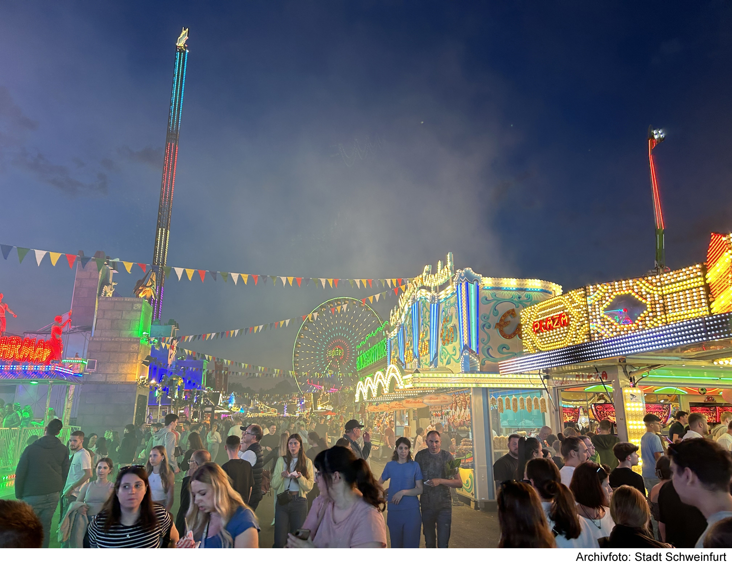 Die Attraktionen „Flip Fly“ und die Familienwildwasserbahn „Wildwasser“ gehören zu den bekannten Fahrgeschäften auf dem Schweinfurter Volksfest. Das „Glaswerk“, ein Labyrinth aus Spiegeln und Glasscheiben, bietet Unterhaltung hinter Glas. Auch die beliebten Klassiker wie der Autoskooter – dieses Jahr mit fabrikneuen Fahrzeugen –, der „Wellenflug“ und „Break Dance“ sind vertreten. Darüber hinaus wird das Riesenrad ebenfalls verfügbar sein.