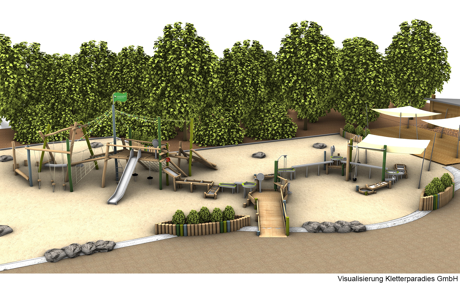 Der Wasserspielplatz wird durch ein ganzjährig nutzbares Klettergerüst samt Rutsche erweitert. Unterschiedliche Netze, übereinander angeordnete Stämme und eine Leiter bieten vielfältige und motorisch unterschiedlich anspruchsvolle Möglichkeiten, das Klettergerüst zu nutzen. Eine Kurbelpumpe auf dem Deck des Klettergerüstet ist das verbindende Element zwischen Kletter- und Wasserbereich. Von hier aus fließt das geförderte Wasser aus luftiger Höhe in die Tiefe. „Mit dem neuen Wasserspielplatz bekommt unser Zoo ein neues Highlight, was ganzjährig und besonders an heißen Sommer-Tagen zum Entdecken, Experimentieren und Verweilen einlädt“, freut sich Zoodirektorin Astrid Stewin. In unmittelbarer Nähe zur Spielfläche entsteht eine Ruhe- und Aufenthaltszone, die mit Sonnensegeln und Wellenliegen ausgestattet wird.