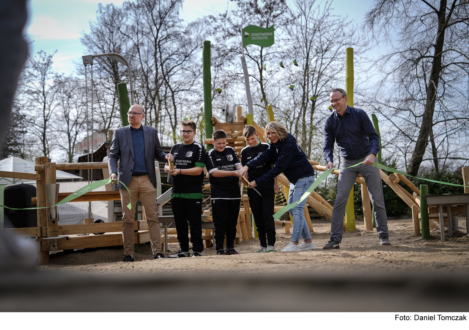 Der Zoo Duisburg hat ein neues Highlight: Auf dem Wasserspielplatz erleben Kinder das Element Wasser mit allen Sinnen. Hier lässt sich nach Herzenslust matschen, klettern und rutschen. Oberbürgermeister Sören Link, Stadtwerke-Vorstandsmitglied Andreas Gutschek und Zoodirektorin Astrid Stewin eröffneten das neue Spielareal gemeinsam mit einer Fußballmannschaft des FC Rumeln Kaldenhausen – und das pünktlich zum Weltwassertag, der jedes Jahr am 22. März gefeiert wird.